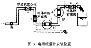 水平安裝時(shí)要使電極軸線平行于地平線,因?yàn)樘幱诘撞康碾姌O易被沉積物覆蓋,而頂部電極易被液體中偶存的氣泡擦過遮住電極表面,使輸出信號(hào)波動(dòng)。例如圖3所示管系中,c和d為適宜位置;