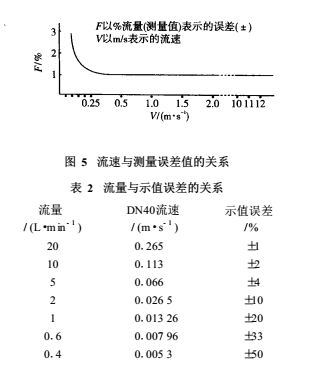 由EMF的測(cè)量原理可知,其流量的下限由同噪聲或偏移的信噪比S/N 來決定,其上限則由測(cè)量管內(nèi)襯里的磨損和配管的經(jīng)濟(jì)速度等來決定。一般當(dāng)測(cè)量管內(nèi)實(shí)際流速小于0.1m/s時(shí),感應(yīng)電動(dòng)勢(shì)已變得十分微弱(幾微伏至零點(diǎn)幾微伏),此時(shí)噪聲的影響逐步變?yōu)橹鲗?dǎo),甚至淹沒信號(hào)電動(dòng)勢(shì)。其流速和測(cè)量誤差的關(guān)系詳見圖 5和表2。