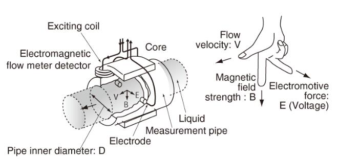 根據(jù)法拉*感應(yīng)定律,在磁場(chǎng)內(nèi)移動(dòng)導(dǎo)電液體會(huì)產(chǎn)生管內(nèi)徑,磁場(chǎng)強(qiáng)度和平均流速都成比例的電動(dòng)勢(shì)(電壓)。換句話說(shuō),在磁場(chǎng)中移動(dòng)的液體的流速被轉(zhuǎn)換成電力。(E正比于V×B×D)