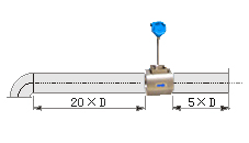 若傳感器安裝點(diǎn)的上游在同一平面上有二個(gè)90°彎頭,傳感器上游應(yīng)有不小于25D的等徑直管段,下游應(yīng)有不小于5D的等徑直管段。