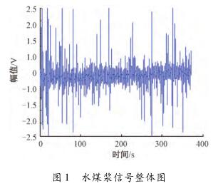 針對(duì)暖通中央空調(diào)管道水流量計(jì)測(cè)量水煤漿時(shí)出現(xiàn)較大波動(dòng),甚至回零這一問題,特去某煤化工企業(yè)甲醇分公司進(jìn)行現(xiàn)場數(shù)據(jù)采集。該公司所使用的對(duì)置式四噴嘴氣化有4個(gè)噴嘴,噴嘴管道口徑為125mm,管中水煤漿流量基本穩(wěn)定在19m³/h(流速約為0.48m/s)。每條噴嘴煤漿線上安裝了3臺(tái)暖通中央空調(diào)管道水流量計(jì),每臺(tái)暖通中央空調(diào)管道水流量計(jì)由傳感器和變送器兩部分組成。選擇其中1條水煤漿管線上的1臺(tái)暖通中央空調(diào)管道水流量計(jì)進(jìn)行數(shù)據(jù)采集,因?yàn)樵撆_(tái)暖通中央空調(diào)管道水流量計(jì)測(cè)量結(jié)果波動(dòng)大,甚至出現(xiàn)回零的現(xiàn)象。將課題組研制的基于DSP的電磁流量變送器的信號(hào)線和勵(lì)磁線接到該電磁流量傳感器的電極和勵(lì)磁線圈上,組合成完整的暖通中央空調(diào)管道水流量計(jì),進(jìn)行水煤漿數(shù)據(jù)采集。使用的電磁流量變送器是以TI公司DSP芯片TMS320F28335為核心,采用高頻勵(lì)磁方案,其硬件主要包括勵(lì)磁控制系統(tǒng)和信號(hào)采集處理系統(tǒng),具體的模塊有勵(lì)磁驅(qū)動(dòng)模塊、信號(hào)調(diào)理采集模塊、信號(hào)處理控制模塊、人機(jī)接口模塊、通信模塊及電源管理模塊。信號(hào)調(diào)理采集模塊中的調(diào)理電路對(duì)一次儀表輸出的信號(hào)進(jìn)行放大和濾波,截止頻率是2kHz,放大倍數(shù)約為230倍。通過NI公司USB-6216型號(hào)的數(shù)據(jù)采集卡進(jìn)行數(shù)據(jù)采集,把調(diào)理電路的輸出端連接到數(shù)據(jù)采集卡的一個(gè)差分輸入端,并設(shè)置數(shù)據(jù)采集卡工作在差分的測(cè)量模式,設(shè)置采集卡的采樣頻率為10kHz。采集多組水煤漿信號(hào)數(shù)據(jù),每組數(shù)據(jù)的時(shí)間長度為5min。