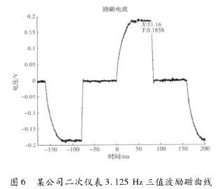 *先,采用某公司生產(chǎn)的二次儀表匹配一次儀表進行勵磁。該二次儀表采用在H橋低端設(shè)置恒流晶體管進行恒流控制的方法,其勵磁曲線結(jié)果如圖6所示,勵磁頻率為3.125Hz,勵磁方式為三值波勵磁,勵磁電流大約在51.16ms左右進入穩(wěn)態(tài),勵磁電流穩(wěn)態(tài)段波動較大。