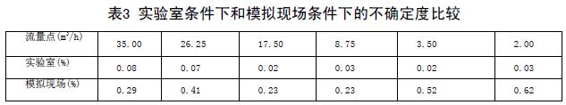 實(shí)驗(yàn)室條件下和模擬現(xiàn)場(chǎng)條件下的不確定度比較(表3)兩次結(jié)果可以看出,兩次實(shí)驗(yàn)各個(gè)流量點(diǎn)的不確定度差距非常大??梢?jiàn),井水流量計(jì)對(duì)安裝條件還是比較苛刻的。