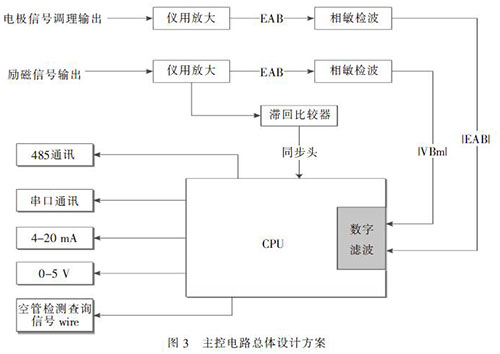 電極檢測(cè)出的微弱感應(yīng)電動(dòng)勢(shì)E, 先經(jīng)前置放大器的放大和噪聲抑制而成為大幅度低阻抗的電壓信號(hào)。此信號(hào)經(jīng)相敏檢波后,給CPU 進(jìn)行數(shù)字濾波、處理和控制,通過(guò)利用雙線性變換法將模擬的二階巴特沃斯低通濾波器轉(zhuǎn)換為數(shù)字式濾波器,既簡(jiǎn)化電路設(shè)計(jì),且可靠性高、穩(wěn)定性好。通過(guò)編寫(xiě)軟件CPU 能對(duì)放大器的溫度漂移及零點(diǎn)漂移給予補(bǔ)償, 并在測(cè)量的全量程范圍內(nèi)分10 段對(duì)信號(hào)進(jìn)行非線性修正,使得測(cè)量值更好地?cái)M合真實(shí)數(shù)據(jù)??展軝z測(cè)電路上,CPU 作為從控制器。當(dāng)主控制電路上發(fā)出空管檢測(cè)查詢(xún)信號(hào)wire, 從控制器進(jìn)行識(shí)別后接收并判斷出查詢(xún)什么信號(hào),然后產(chǎn)生應(yīng)答信號(hào)上傳至主控芯片輸出顯示;當(dāng)檢測(cè)為空管信號(hào)時(shí), 從CPU 發(fā)出的zero 信號(hào)通過(guò)控制MOS 管開(kāi)關(guān)來(lái)關(guān)斷流速輸出。在應(yīng)用中,對(duì)于微弱信號(hào)的放大及提取還需注意PCB 板設(shè)計(jì)時(shí)EMI 電磁屏蔽考慮,屏蔽來(lái)自空間磁場(chǎng)的干擾、周邊設(shè)備的輻射造成的干擾和板內(nèi)之間的干擾,如數(shù)模分離、強(qiáng)弱電分離等等。