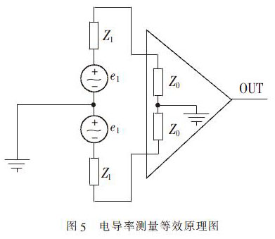 電路為對(duì)稱(chēng)結(jié)構(gòu),圖中e1和Z1分別是傳感器的流量信號(hào)和對(duì)應(yīng)的流體阻抗,Z0為放大器的輸入阻抗。