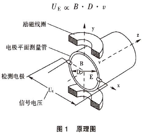 產(chǎn)生與流量成比例的感應(yīng)電勢,流體中產(chǎn)生的感應(yīng)電動勢被位于管子徑向兩端的一對電極拾取,該信號電壓uE與磁場強度B、電極間距離D和平均流速穢成正比。磁場強度B和電極距離D是常數(shù),所以信號電壓與平均流速口成正比。計算公式如下:
