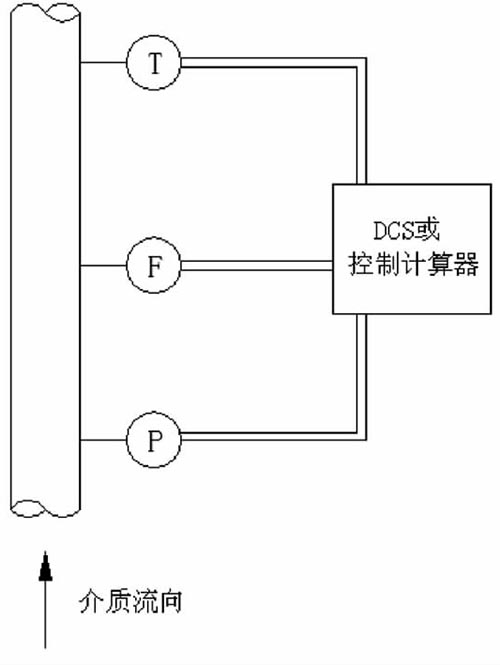 流量計(jì)、溫度變送器、壓力變送器單獨(dú)安裝,流量信號(hào)、溫度信號(hào)、壓力信號(hào)分別輸入DCS或控制計(jì)算器進(jìn)行流量的溫度、壓力補(bǔ)償計(jì)算,完成流量、壓力、溫度各參數(shù)的顯示、輸出、打印等功能。此種結(jié)構(gòu)安裝靈活,特別適用于現(xiàn)場(chǎng)流量計(jì)的升級(jí)改造,如圖2所示。號(hào)、溫度信號(hào)、壓力信號(hào)輸入到溫壓補(bǔ)償功能設(shè)計(jì)的流量計(jì)轉(zhuǎn)換器中,進(jìn)行流量的溫度、壓力補(bǔ)償計(jì)算,完成流量、壓力、溫度各參數(shù)的顯示、輸出、打印等功能。此種結(jié)構(gòu)測(cè)量準(zhǔn)確度高,體積小,安裝方便,如圖3所示: