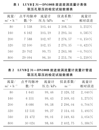 以使用廣泛的DN100B天燃?xì)饬髁坑?/strong>為例,系統(tǒng)運行時間為60s,標(biāo)準(zhǔn)裝置的滯止平均溫度為28.9℃,空間平均濕度為30%,流量計的平均溫度為28.3℃,在表體取壓孔取壓和管道取壓孔取壓的流量計檢定試驗數(shù)據(jù)分別如表1、2所示。