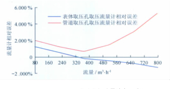 從以上數(shù)據(jù)表和曲線圖中可以看出:天燃?xì)饬髁坑?/strong>型號一定的情況下,用表體取壓孔取壓方式檢定流量計時流量計的線性度較好,用管道取壓孔取壓方式檢定流量計時流量計的線性度較差;流量測點相同的情況下,表體取壓孔取壓檢定方式的流量計誤差較小,管道取壓孔取壓檢定方式的流量計誤差較大;兩種取壓方式引起的誤差隨著流量的增大而逐漸增大,在流量為2?。梗埃埃恚常钑r兩者相差近6.2%,遠(yuǎn)遠(yuǎn)超出了流量計的準(zhǔn)確度等級。所以,在天燃?xì)饬髁坑?/strong>的檢定過程中,應(yīng)避免在流量計表體取壓孔以外的地方取壓進行檢定。