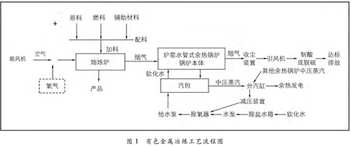 在有色金屬冶煉過程中,將原料、燃料和輔助材料根據(jù)熱平衡原理按一定比例進行配料,配料后的物料與空氣或高含氧的混合空氣在熔煉爐中進行氧化或還原反應(yīng),熔煉出有色金屬產(chǎn)品。同時,在熔煉過程中會產(chǎn)生大量的高溫?zé)煔猓?1200 ℃ 左右),高溫?zé)煔饨?jīng)過余熱鍋爐時,與余熱鍋爐水側(cè)的軟化水進行熱量交換,煙溫迅速降至 250℃ 以下,再經(jīng)收塵、制酸或脫硫裝置進一步收塵、降溫、凈化,*終達(dá)標(biāo)排放。余熱鍋爐水側(cè)的軟化水經(jīng)熱量交換后產(chǎn)生中壓飽和蒸汽(4 MPa 左右),送至余熱發(fā)電機組發(fā)電。具體的工藝流程如圖 1 所示。