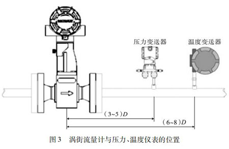 氫氣流量計的口徑如果與工藝管道相同,不能滿足流量儀表要求時,或者在此流速下測量準確度不能保證時,需要縮小儀表口徑,從而提高管內(nèi)流速,保證測量精度。上下游必須有足夠的直管段,若傳感器安裝點的上游在同一平面上有 2 個 90°彎頭時,上游直管段≥25D,下游直管段≥5D。根據(jù)測量的需要,需在氫氣流量計附近測量壓力和溫度時,測壓點應在傳感器下游的( 3 ~ 5) D 處,測溫點應在傳感器下游的( 6 ~ 8) D 處,如圖 3 所示。