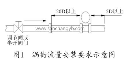 根據(jù)圖1渦街流量安裝要求示意圖及廠(chǎng)家的設(shè)備說(shuō)明書(shū)要求,流量計(jì)上游的直管段長(zhǎng)度至少為20D≈1 600mm,下游的直管段至少在5D≈400mm,D=80mm 為管道直徑。圖2為現(xiàn)場(chǎng)安裝圖,流量計(jì)上游僅為600mm <1 600mm,此流量計(jì)安裝位置有誤,對(duì)測(cè)量值有一定的影響,造成測(cè)量偏差,需調(diào)整流量計(jì)的安裝位置。