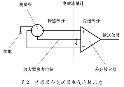 防腐型電磁流量計主要由兩部分組成:流量傳感器和信號變送器,如圖 2 所示。傳感器上的勵磁線圈接受變送器傳輸來的勵磁電流產(chǎn)生磁場,輸出感應電動勢信號;信號變送器則將感應電動勢信號轉換為流量信號或模擬量信號送至控制系統(tǒng)。防腐型電磁流量計按組成方式分為一體式和分體式。防腐型電磁流量計穩(wěn)定工作另外一個重要條件是接地。當流體流動穿過磁場時,以導電流體本身作為參考電位,在測量管一側電極產(chǎn)生正電勢,另一側產(chǎn)生負電勢,形成電勢差。但此電動勢信號一般只有幾毫伏,易受外界干擾。為防止干擾,將參考電位接入大地作為零電位,保證傳感器輸出精確穩(wěn)定的信號。傳感器和轉換器的接地端必須與被測介質同電位,才能構成對稱的輸入輸出回路。