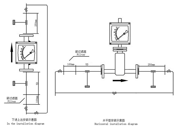 4.若介質(zhì)中含有固體雜質(zhì),應(yīng)在閥門和直管段間加裝過(guò)濾器;若介質(zhì)中含有鐵磁物質(zhì),應(yīng)在指針浮子流量計(jì)的上游安裝磁過(guò)濾器。